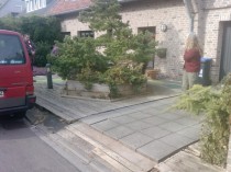 Die Auffahrt nebst Gehweg wurden komplett neu verlegt. Hierzu wurden alte Betonfundamente und Platten entfernt und durch RCL-Schüttung und Splitt ersetzt.